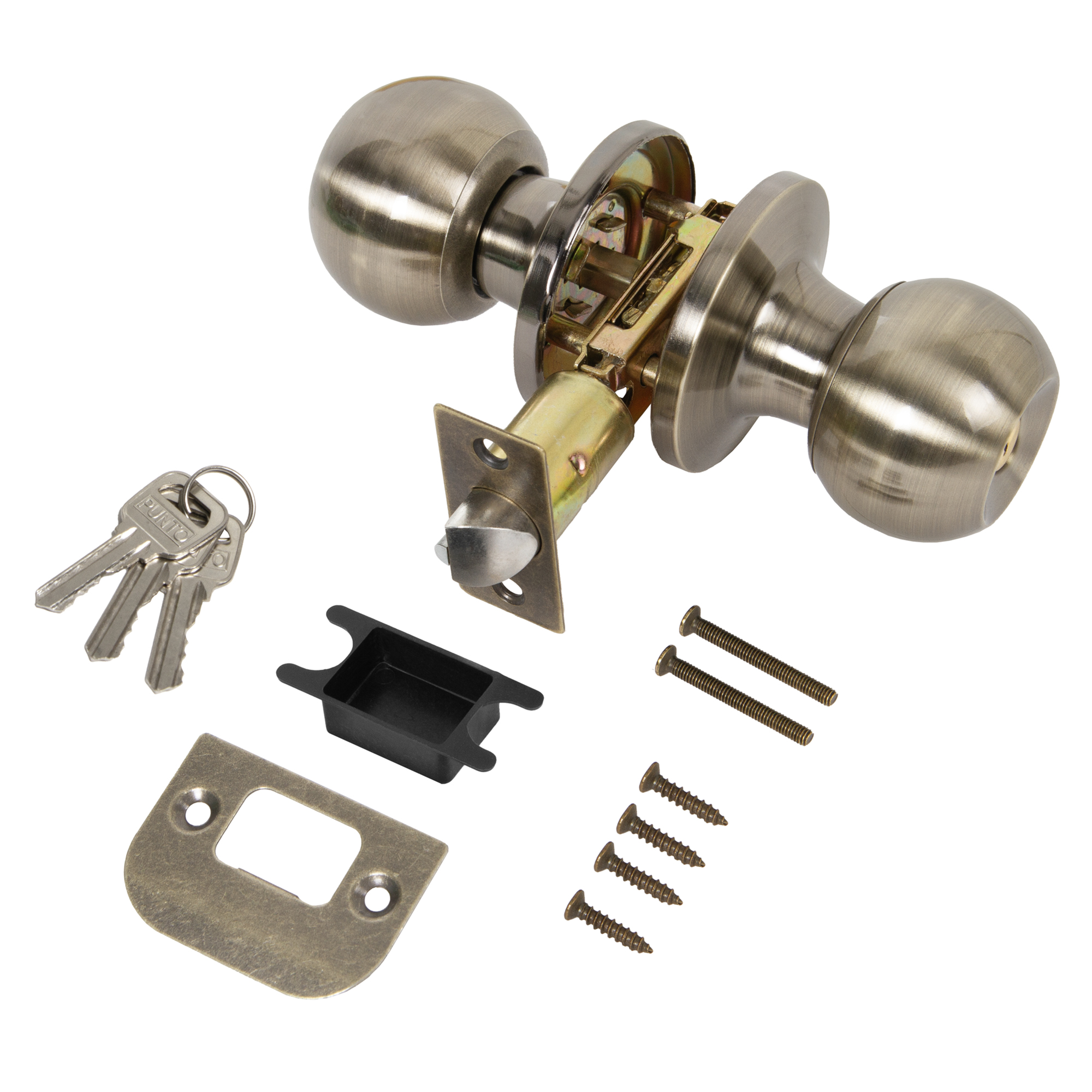 Комплект дверных ручек с защелкой (KNOB) Punto предназначен для установки в межкомнатные двери толщиной 35-45 мм. Подходит для дверей правого и левого открывания. Гальваническое покрытие прошло тест на устойчивость к коррозии в соляном тумане и соответствует 1 классу ГОСТ. Бэксет защелки регулируется - 60/70 мм. Материал изготовления: сталь. Комплектация: защелка, ответная планка с декоративной заглушкой, дверные ручки, крепежная фурнитура, шаблон и инструкция по установке.